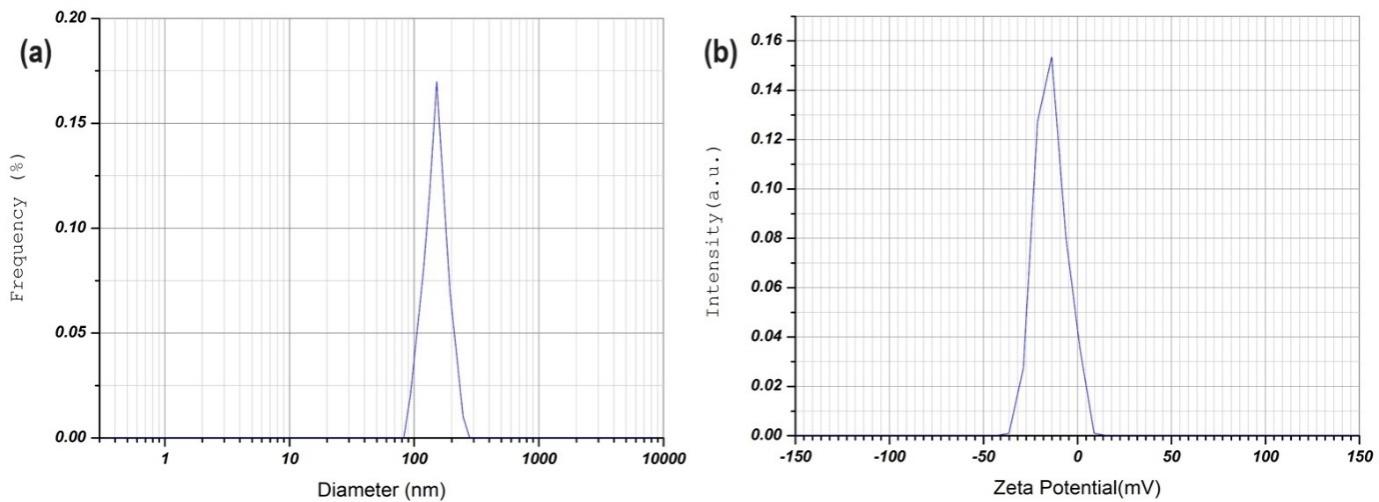 Fig. 5: (a) Particle size distribution and (b) Zeta potential of the optimized PNCs as determined by dynamic light scattering technique using Horiba SZ-100