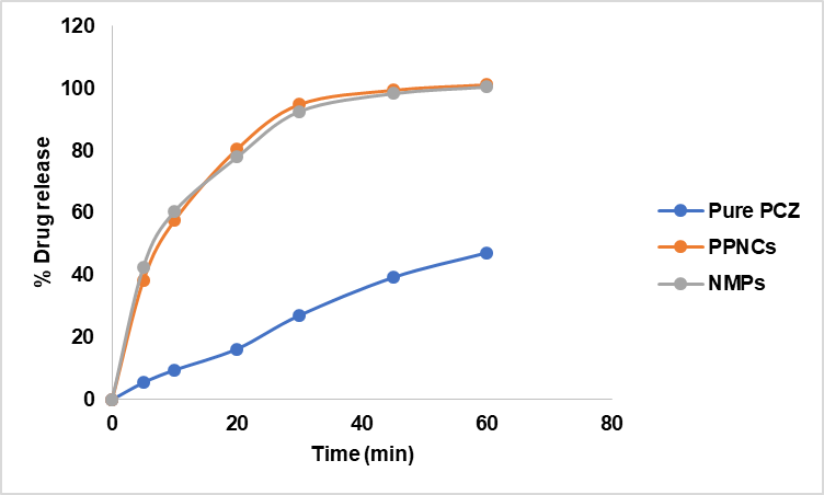 Dissolution studies for the prepared PNCs were conducted in the USFDA-suggested medium, i. e., 900 ml of 0.3% w/v sodium lauryl sulfate [5]. The study was carried out for a period of 1 h with the paddle apparatus set at 25 rpm. Dissolution samples were taken periodically, diluted suitably, and quantified spectrophotometrically. The obtained data was treated kinetically with zero-order and first-order models. Then the dissolution rate constant (k) and T90% were calculated.