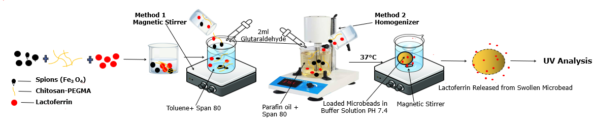 25 mg of lactoferrin was dissolved in 2.5 ml of water to form Solution A. Then, this solution was mixed with 10 g of 1% PEGMA-g-Cs in 1% acetic acid to create Solution B. 200 µl of SPIONs was added to the second solution, forming Solution C. the last solution was added to 100 ml of paraffin oil containing 2 ml of Span 80 while stirring at 700 rpm,. After 10 min, 1 ml of glutaraldehyde was added, followed by another 1 ml after 50 min, with a total reaction time of 2 h. The drug-loaded microbeads were washed with petroleum ether and dried at 25 °C for 12 h. SEM and UV-Vis spectrophotometry were used to characterise synthesised materials.