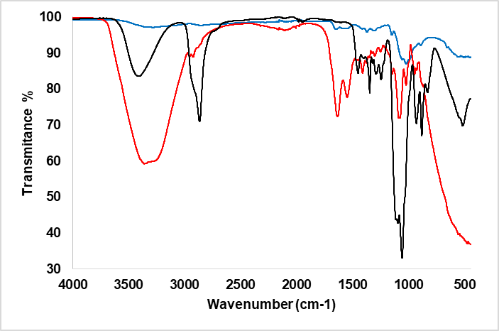 Fig. 3: FT-IR spectra of chitosan (-blue line), PEGMA-g-Cs copolymer (-red line) and only PEGMA (-black line) confirming successful preparation of PEGMA-g-Cs