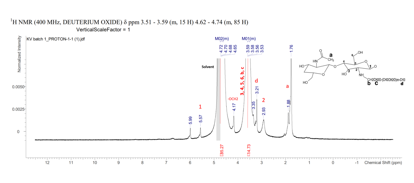 1HNMR (JOEL ECZS series, 400 MHz) was also used to obtain more detailed information about the chemical structure of the newly devel ped polymer. Fig. 4 shows the 1H-NMR spectra of the PEGMA-g-Chitosan copolymer. The diagnostic peaks are as follows: 1.76 ppm (3H, s, CH3 of Chitosan). 2.93 ppm (1H, s, H-2 of Chitosan), 3.21 ppm (3H, s, methyl group of PEGMA), peaks observed in the range of 3.51–3.59 ppm (m, H-3, H-4, H-5, H-6, H-6' of chitosan and –OCH2– (c),-CH2 (b) of PEG), 4.17 ppm (2H, s,-OCH2-of PEG chain). The combination of IR and 1HNMR data indicates that the PEGMA-g-Chitosan copolymer was successfully synthesised.