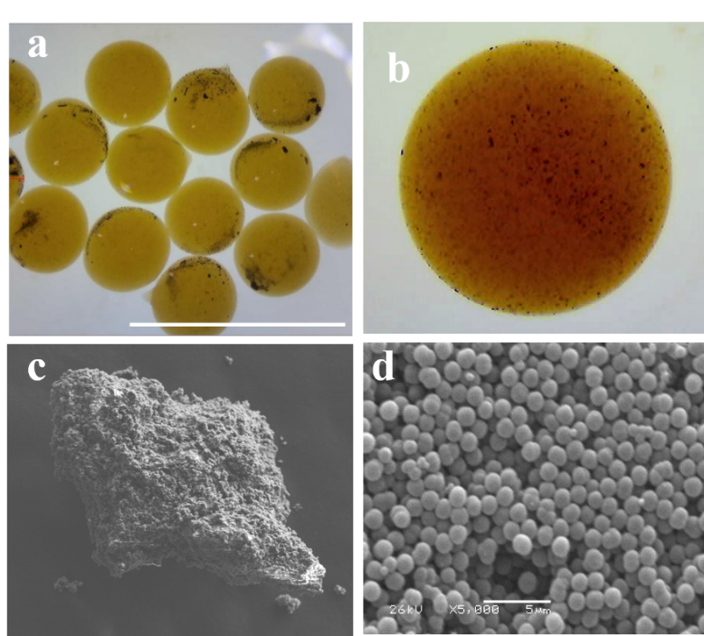 Fig. 5: Optical microscopy and SEM images of PEGMA-g-Cs microbeads. The magnifications for optical images (a) and (b) are 10x and 40x, respectively. Whereas the magnifications for SEM images (c) and (d) are 1000 and 5000, respectively
