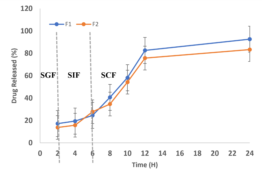The drug release profiles underscore the formulation's potential for controlled release and targeted drug delivery. The distinct release kinetics exhibited by the two batches highlight the role of formulation techniques in modulating release behaviour. The high encapsulation efficiency and varying release profiles pave the way for tailored drug delivery strategies.