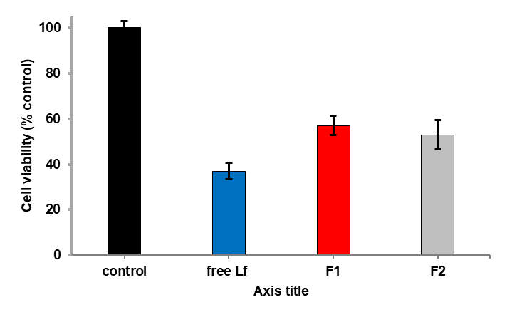 Fig. 7: Cell viability (MTT assays) for free Lactoferrin, F1 and F2 formulations. Data were presented as mean±SD of three independent replications (n=3)