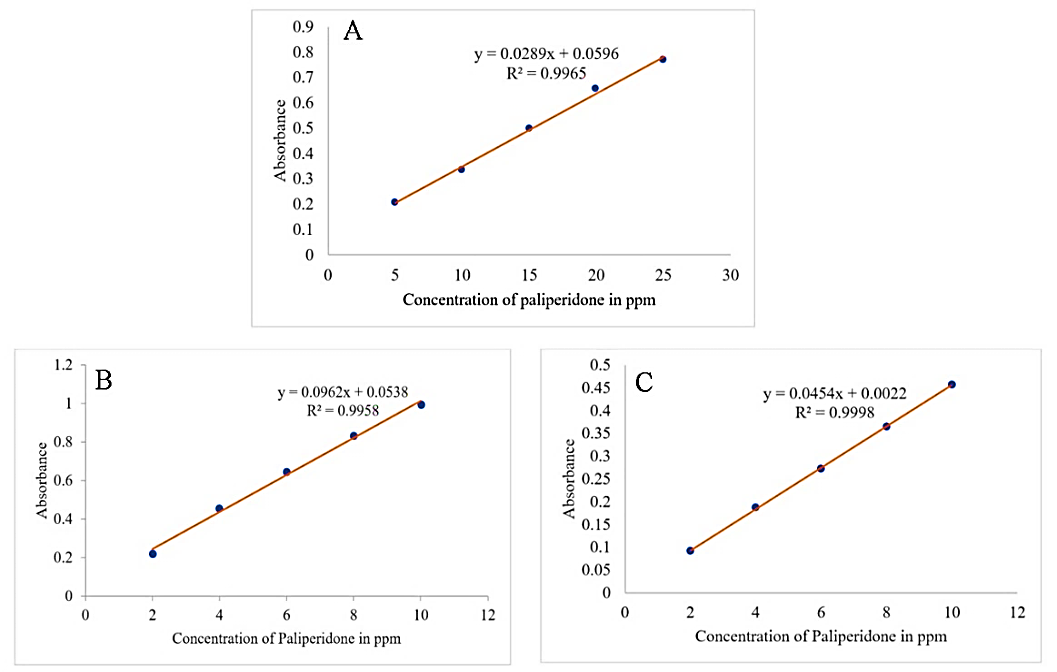 Fig. 1: Calibration curve of paliperidone in distilled water (A), methanol (B) and 6.8 pH phosphate buffer (C)