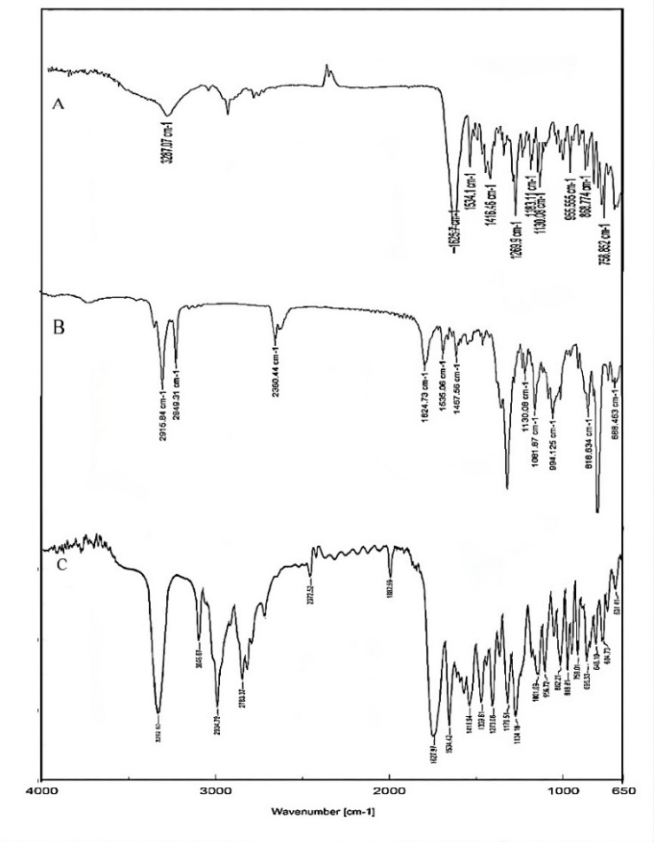 Fig. 2: FTIR results of compatibility study: paliperidone (C), Paliperidone+SLS physical mixture (B), Paliperidone+PVPK30 physical mixture (A)