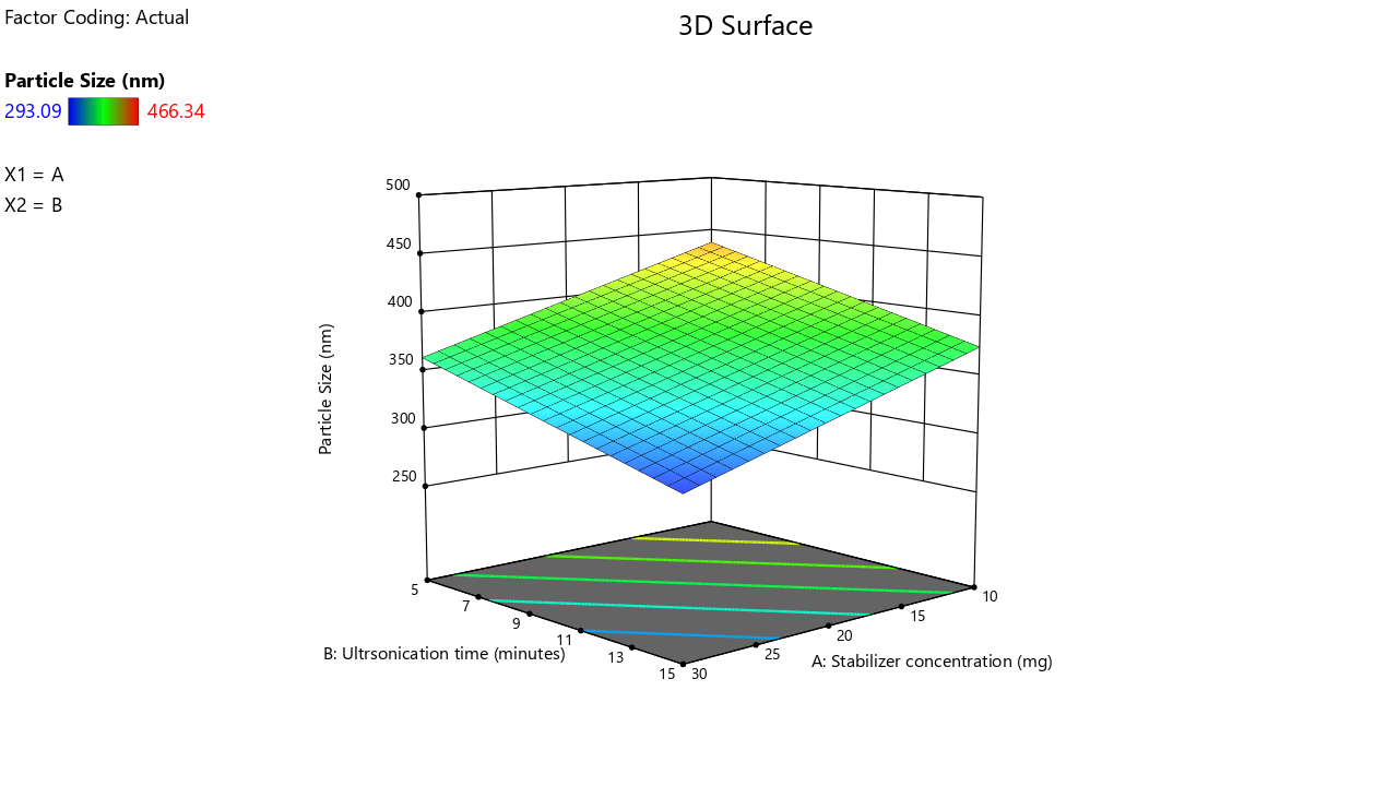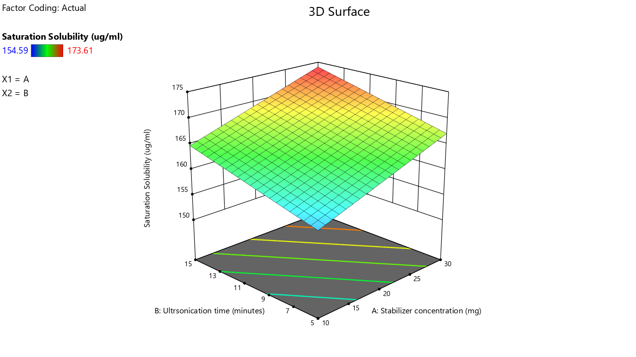 The independent variables in the present investigation selected were the concentration of stabiliser and the probe ultrasonication time. The dependent variables were the particle size and saturation solubility of the resulting nanosuspension. Stabilisers and surfactants are crucial components in the formation of nanosuspensions. Stabilisers as well as surfactants are essential for maintaining the nanosuspension in its nano-sized form. Probe ultrasonication reduces particle size by the utilisation of ultrasonic waves. Therefore, it is essential to ascertain the optimal concentration of stabiliser and the duration of probe ultrasonication for the development of a nanosuspension formulation [14, 15].