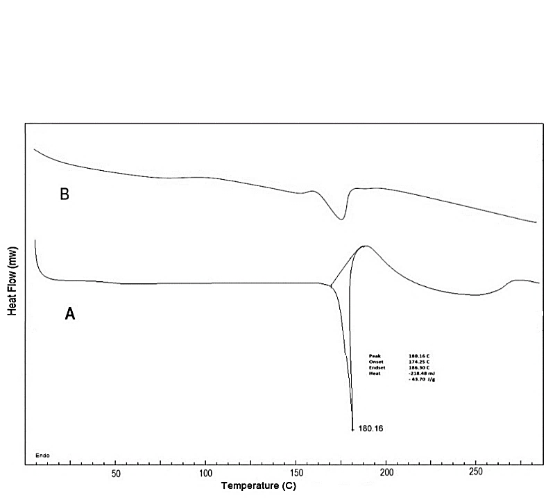 Fig. 6: DSC pattern of pure paliperidone (A) and lyophilised paliperidone nanosuspension (B)