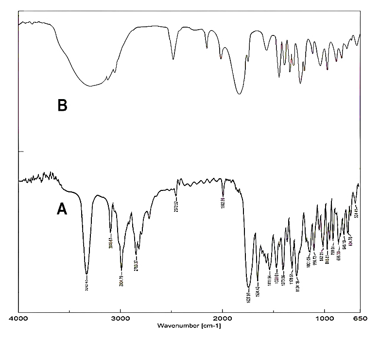 Fig. 7: FTIR spectra of (A) Pure paliperidone and (B) lyophilized paliperidone nanosuspension