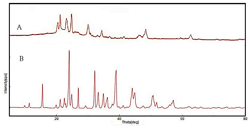 Fig. 9: Comparative XRD of pure paliperidone (B) and optimized paliperidone nanosuspension (A)