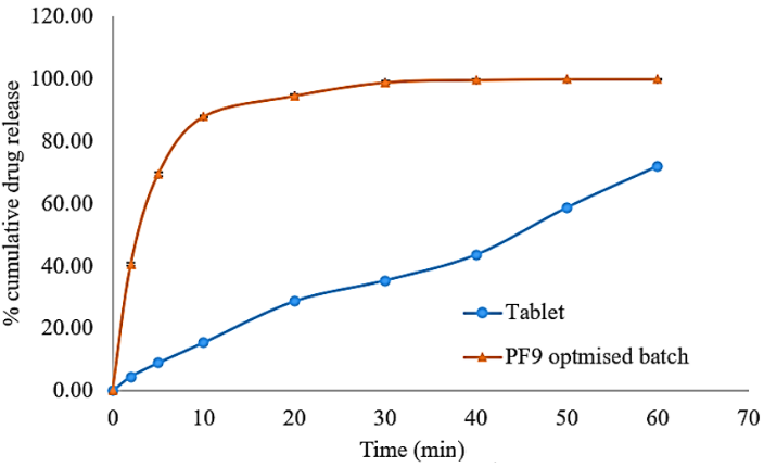 Fig. 11: In vitro drug release pattern of PF9 and tablet formulation. Error bars indicates SEM values n=3)