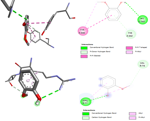 Visualisation of docking results between liquid smoke compounds with DPP4 inhibitor receptors and AGE receptors can be seen in fig. 6. In DPP4 inhibitor receptors, between native ligands and comparator drugs, the identical two amino acid residues were obtained in hydrogen bonds, which are TYR 662 and SER 630, while in hydrophobic bonds, the similar two amino acid residues were obtained, which are TRP 627 and TRP 629. Based on research by Rozano [28] on compounds that have potential as DPP4 inhibitors, the amino acid residues are SER 630 and TYR 662 in hydrogen bonds and in hydrophobic bonds, such as TYR 662, TRP 629 and TYR 631. There are 13 liquid smoke compounds between DPP4 inhibitor receptors and liquid smoke compounds, which are Guaiacol, 2-methyl-2-cyclopentenone, Phenol, 4-Methoxyphenol, 2-Cyclopenten-1-one, 1-Hydroxy-2-Butanone, Butyric Acid, Propionic Acid, Diethyl Ether, 2-Propanone, Acetic Acid, Propylene Sulfide, and Urea that have similar hydrogen and hydrophobic amino acid residues with native ligands, comparator, and previous study [28].