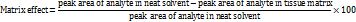 The matrix effect evaluation is very much essential during the method validation because it reveals the effect of the unidentified components present in tissue matrices interfering with the ionization of the analyte during analysis and thereby reducing or increasing the values of the actual concentrations. Four QC samples (10, 30, 500, 4000ng/ml) in sextuplicate were prepared in each tissue matrix and the samples were extracted by protein precipitation. At the same time, QC samples (n=6) were prepared in neat solvent (HPLC-grade water) using the same extraction steps. The matrix effect was calculated as follows [23-26]: