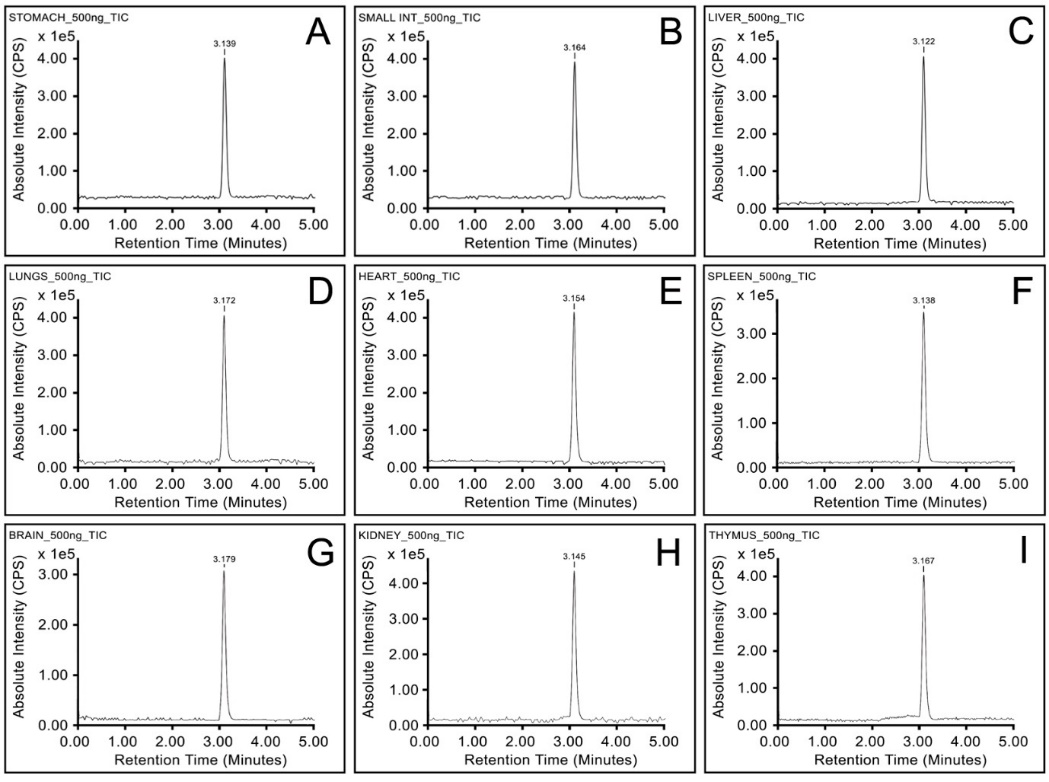 The blank tissue matrices (tissue matrices of the stomach, small intestine, liver, lungs, heart, spleen, brain, kidneys, and thymus) were spiked with the reference standard of PC to produce lLOQ concentration. The blank individual matrix chromatogram was compared with the chromatogram obtained for the spiked tissue matrix and the selectivity was determined.
