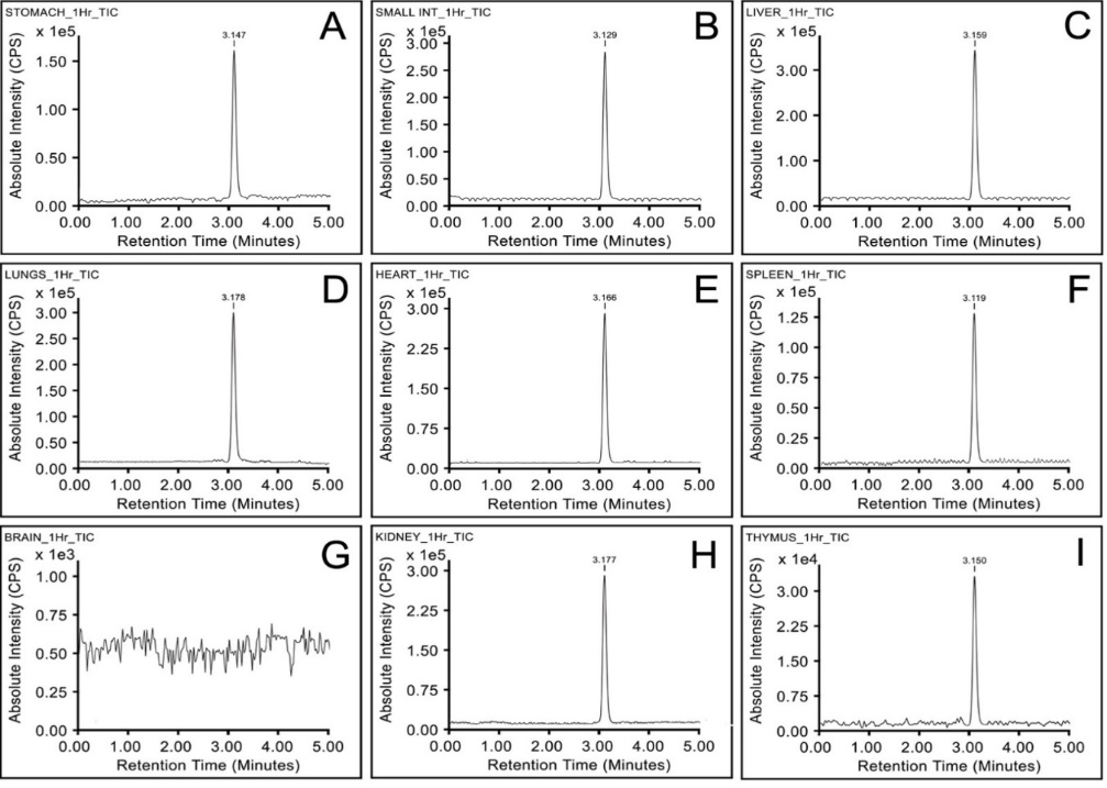 Eight healthy, untreated sprague-dawley rats (4 males and 4 females) were selected for the collection of organs/tissues. The rats were euthanized by an overdose of inhalation general anesthetic agent, isoflurane. The organs of interest such as the stomach, small intestine, liver, lungs, heart, spleen, brain, kidneys, and thymus were excised and immediately cleaned with phosphate buffer saline pH 7.4 (PBS). After cleaning each organ, the surfaces of the organs were dried using filter paper. Without further delay, each Organ was chopped into small pieces and transferred to a hand homogenizer with a small quantity of HPLC-grade water. The coarsely homogenized tissues were then transferred along with the remaining portion of water to a motor-driven homogenizer and were homogenized for 20 min to get fine homogenate. The volume of water added during the homogenization process was 3 times the volume of tissue. The tissue homogenates were pooled separately for individual organs. The pooled homogenates were then centrifuged at 10,000 rpm for 15 min. The supernatants were collected as blank matrices for the above-mentioned tissues.