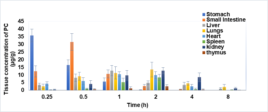 Results: In all the tissue matrices, the concentrations of PC were found in the linear range of 10 to 5000 ng/ml. High level of precision, accuracy, and recovery, with negligible matrix effects, were found. PC was distributed in all tissues except the brain. Pharmacokinetic parameters such as Tmax and MRT were between 1.11±0.12 to 2.33±0.11 h and 2.17±0.16 to 4.01±0.25 h respectively in the liver, lung, heart, spleen, kidney, and thymus.