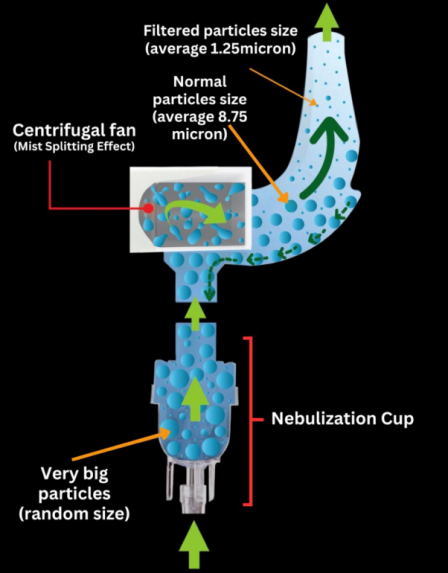 Zap-AirTMMicronizer is a simple device that is made up of a mini air blower, housed inside a curved nozzle polymer casing with a battery. It transforms conventional mist into highly functional mist through a five-step process, which involves sucking, splitting, separating, filtrating, and blowing out, facilitated by a simple curved nozzle fan technology (fig. 1). By effectively filtering out the larger particles, the microniser ensures that the resulting mist predominantly consists of submicron-sized particles.