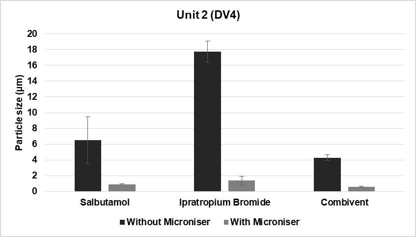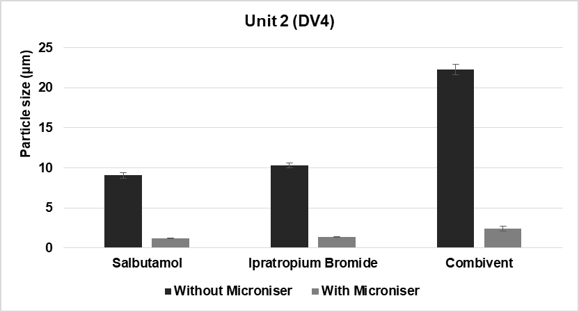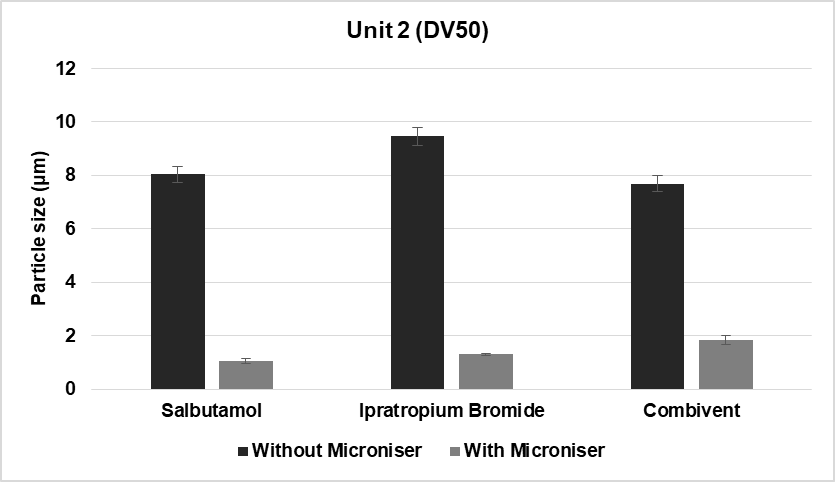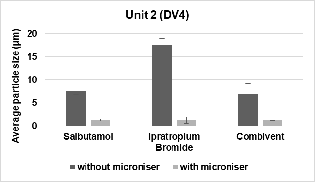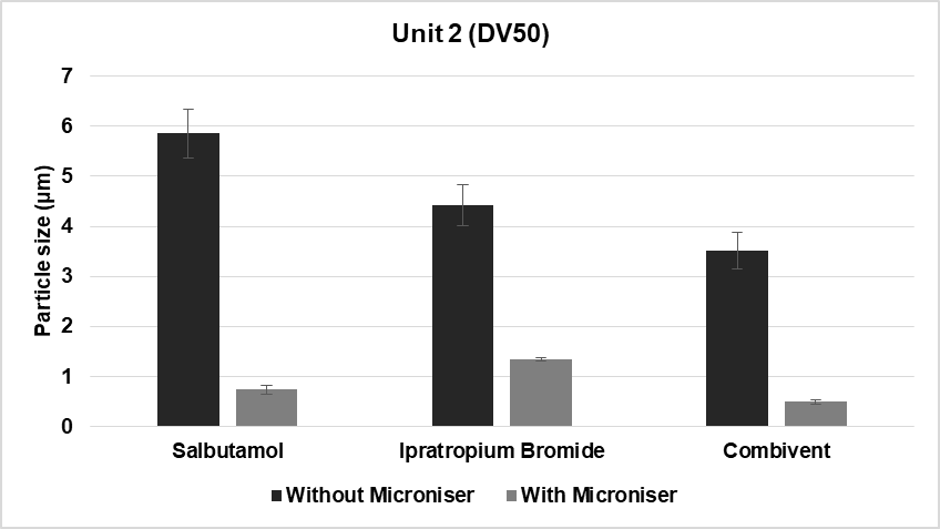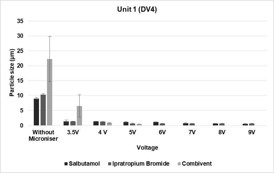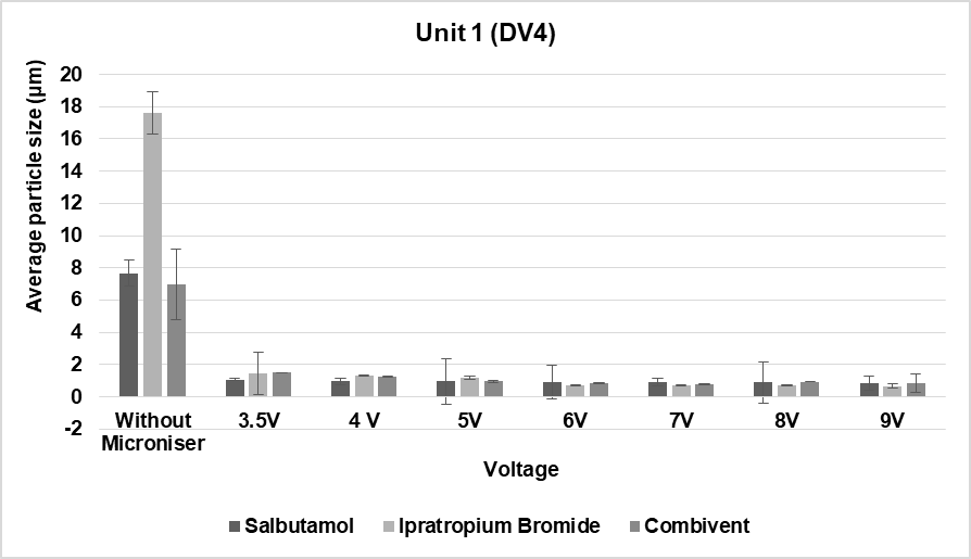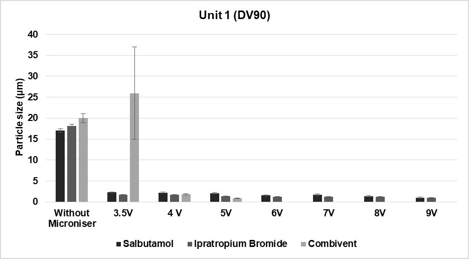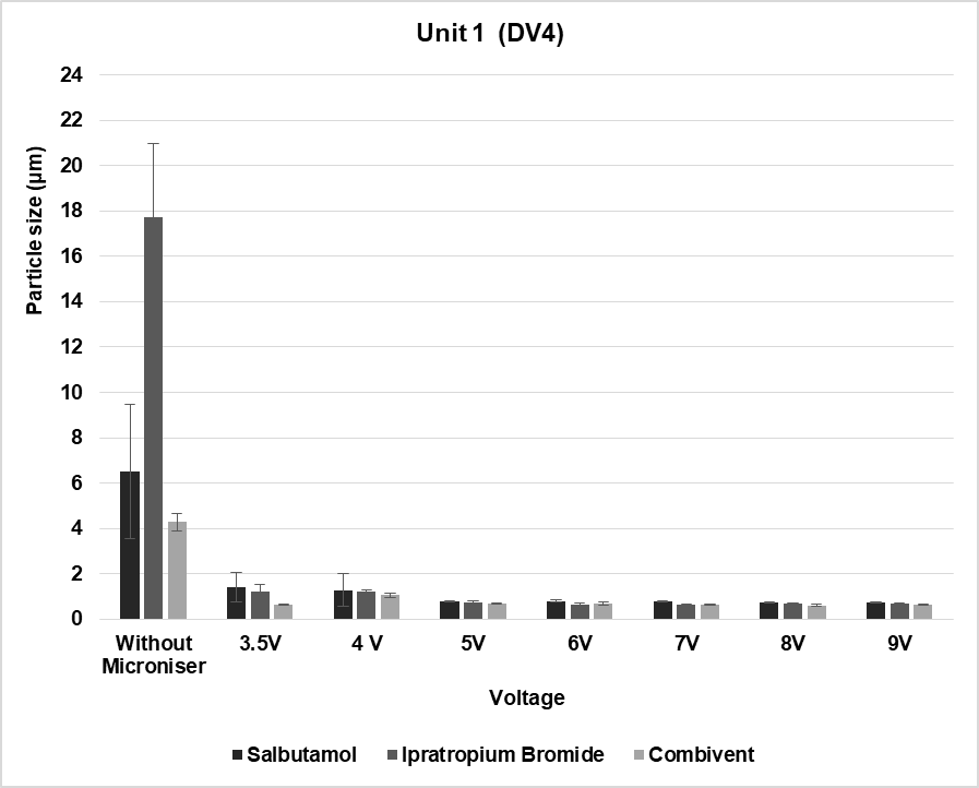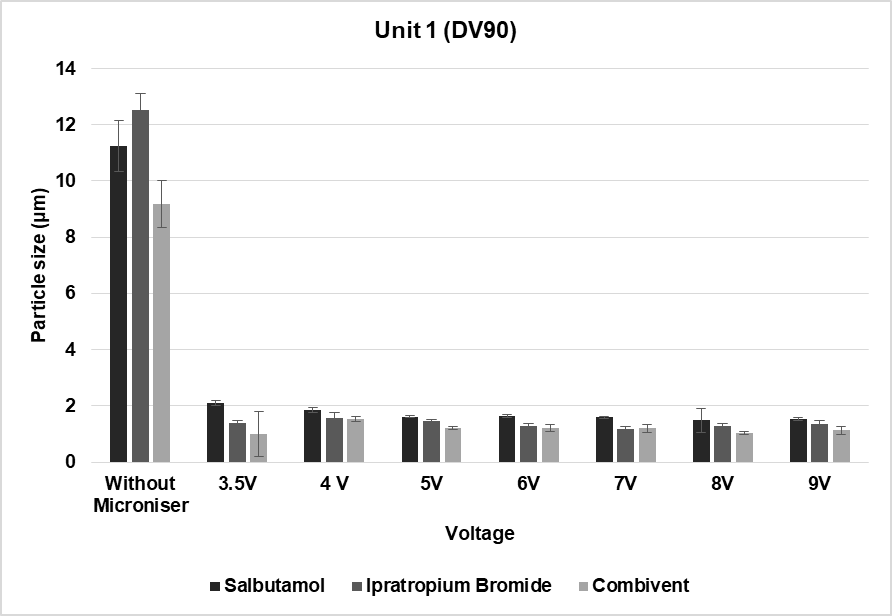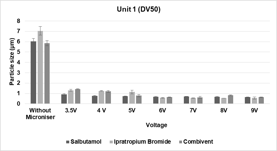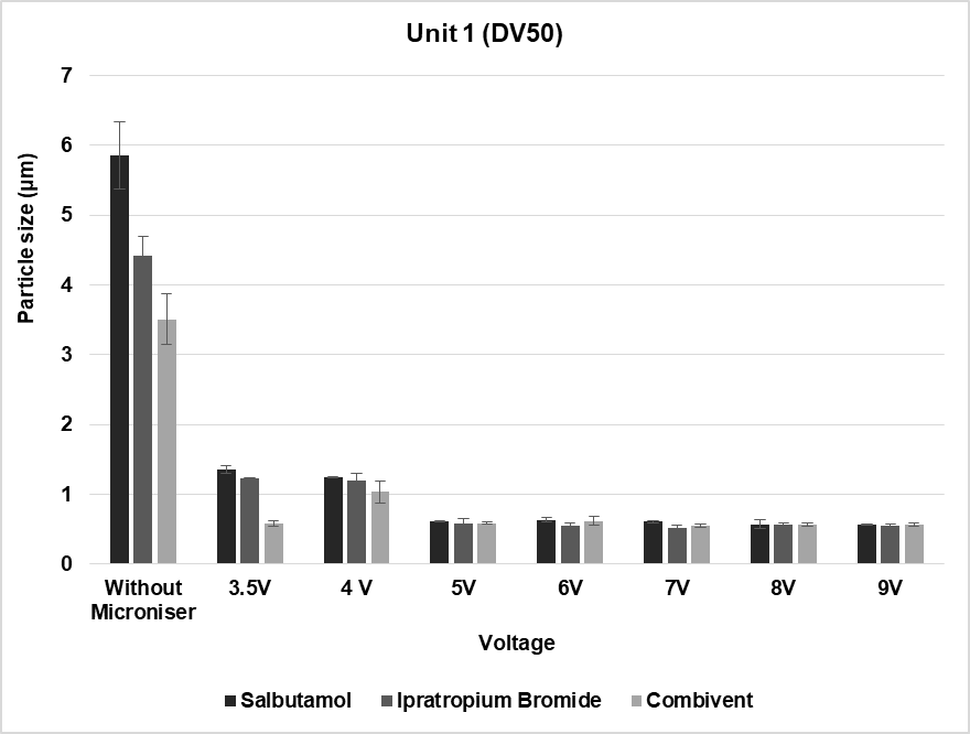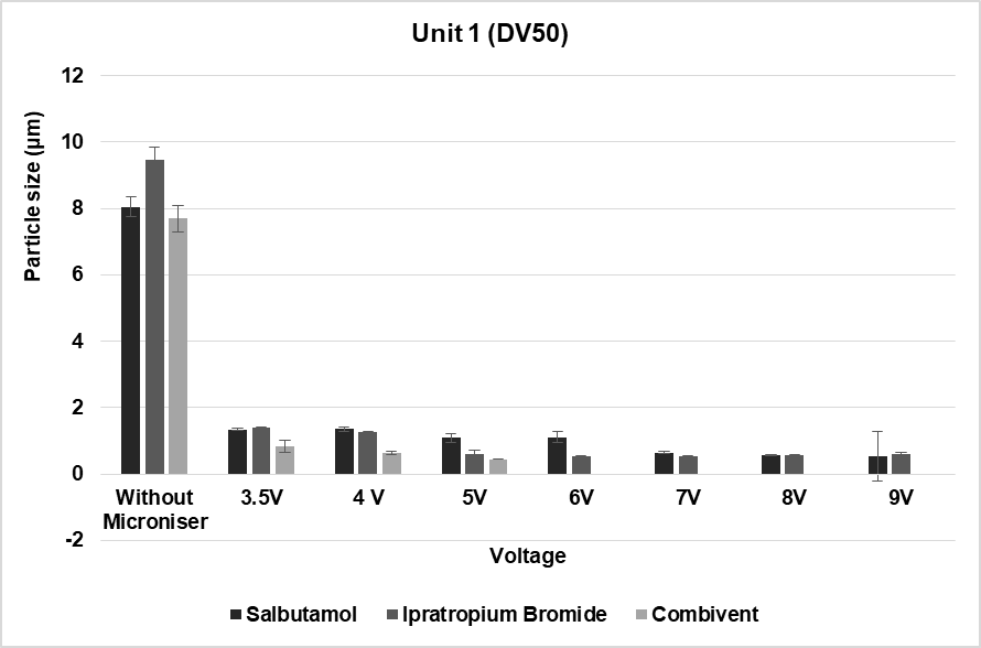 Fig. 6 and 7 depict the particle sizes (DV4, DV50 and DV90) of the drugs using unit 1 and unit 2 micronisers, respectively. Significant size reductions to below 2 µm was achieved for all drugs when the nebuliser was used with the micronisers. However, for unit 1, as the voltage was increased to above 5V, the particle size measurement of combivent from the nebulising system was not able to be obtained.