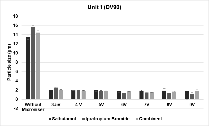 Fig. 9 and 10 depict the particle sizes (DV4, DV50 and DV90) of the drugs using unit 1 and unit 2 micronisers, respectively. Again, the particle size of all drugs was significantly reduced when the micronisers were used with the nebulising system. The MMAD (DV50) of below 1µm was achieved for Unit 1 when the voltage was increased to 5 volts and above. As for unit 2, a particle size below 1 µm was achieved for salbutamol sulphate and Combivent. However, the use of both micronisers managed to reduce the particle size of all drugs to below 2 µm.