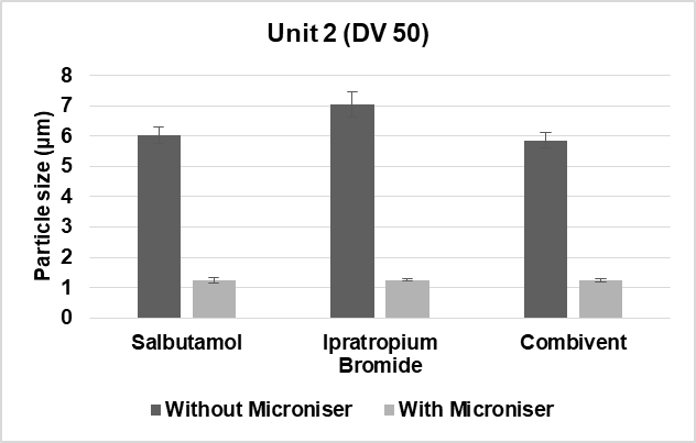 Fig. 3 and 4 depict the particle size (DV4, DV50 and DV90) of the drugs using Unit 1 and Unit 2 micronisers, respectively. From the results obtained, with the various changes in voltage of the unit 1 microniser, the particle size was reduced to below 2 µm for all drugs. Similarly, for unit 2 microniser, the particle size was also significantly reduced to below 2 µm for all drugs. In general, it can be seen that the average particle size of 50% of particles is smaller, which is 1 µm or below.