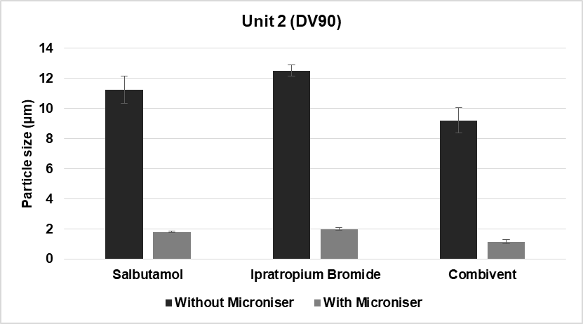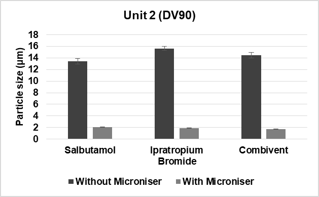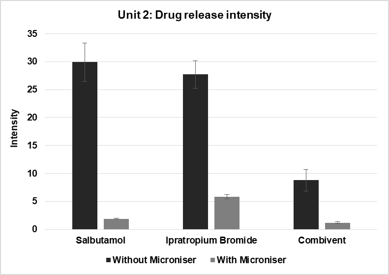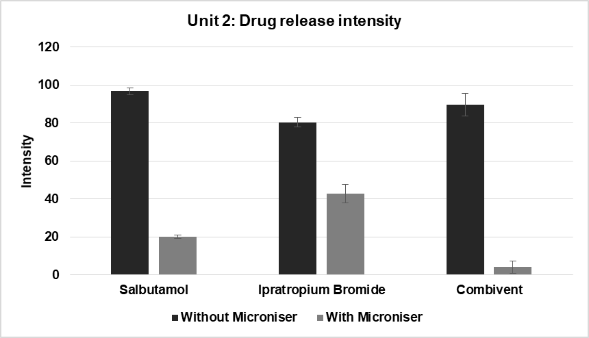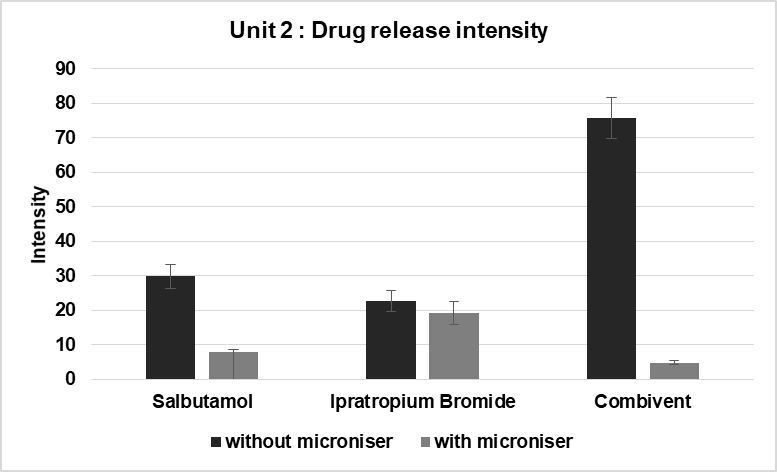 Fig. 11: Drug release intensity from unit 1 and unit 2 micronisers (n = 3). Error bars indicated SD values