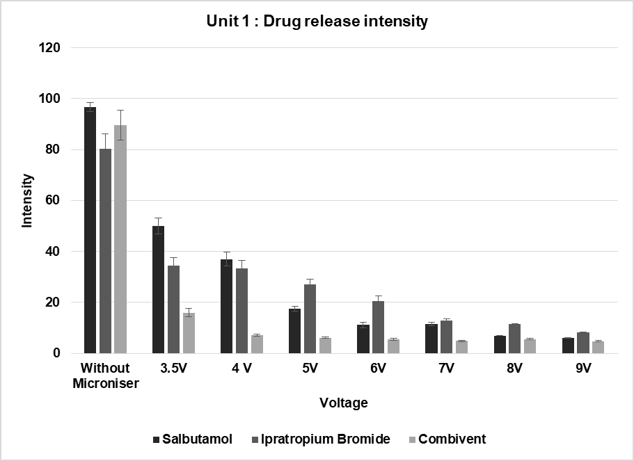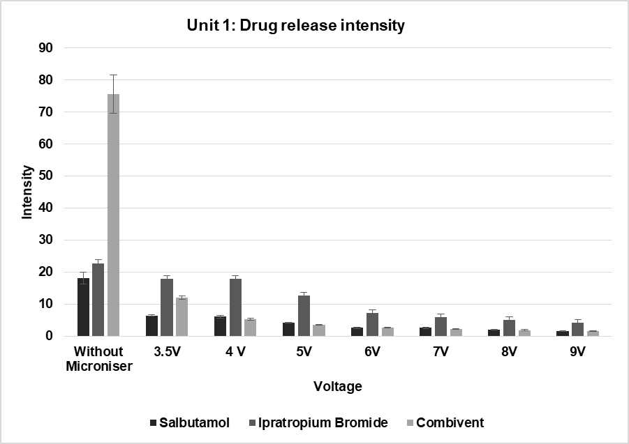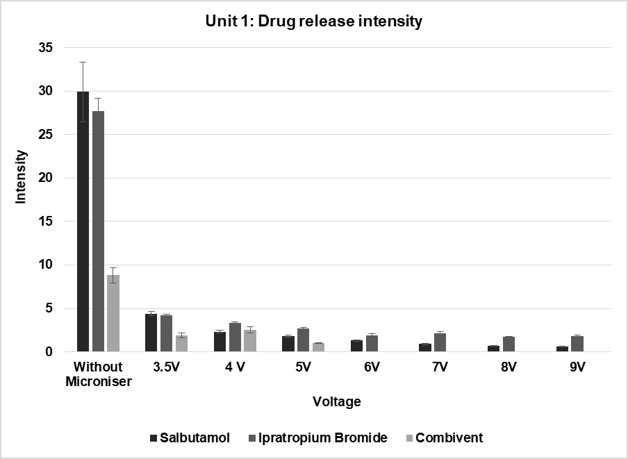 Fig. 8 shows the drug release intensity from both Unit 1 and 2 micronisers. It can be seen that the amount or intensity of the drug being released is significantly reduced. It should also be noted that for unit 1 microniser, when the voltage was increased to above 5 volts, no drug release from combivent was detected.