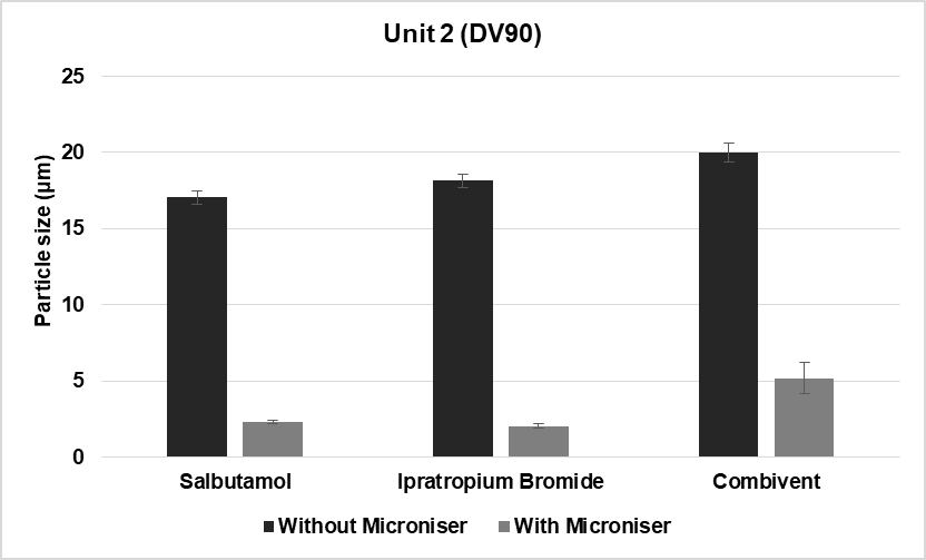 Fig. 10: Particle size of SS, IPB and combivent using unit 2 microniser (n = 3). Error bars indicated SD values