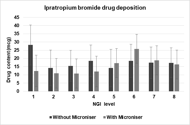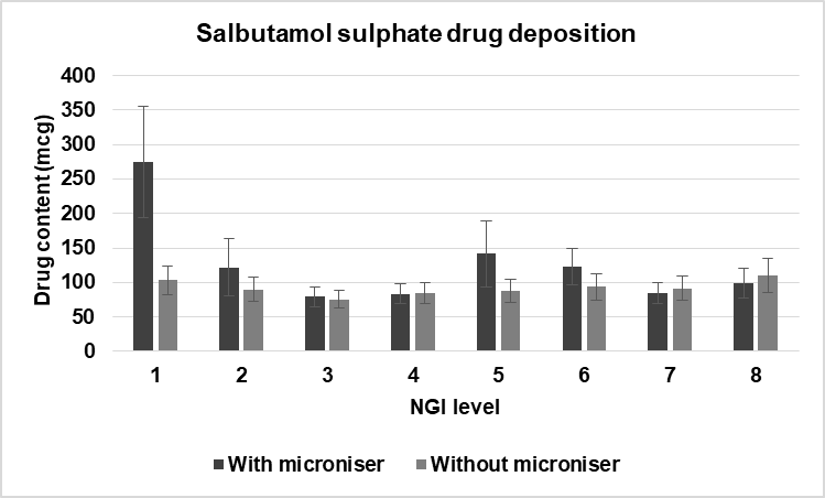 Fig. 12 depicts SS and IPB drug deposition for the NGI stages. Drug deposition for SS is significantly higher at stages 7 and 8 of the NGI when the microniser is used. While for IPB, the deposition of drugs is higher at stages 5 and above, highest at stage 6 of the NGI when the microniser is used. For both drugs, their deposition is highest at stage 1 when the nebuliser is used alone.