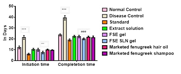 Fig. 1: Hair growth initiation and completion of rats at different times after beginning the treatment of standard, extract solution, FSE gel, FSE SLN gel, Marketed fenugreek hair oil and marketed fenugreek shampoo. Results were showed as mean standard deviation (SD). (*** P<0.001, ### P<0.001), compared with normal control (n=6)