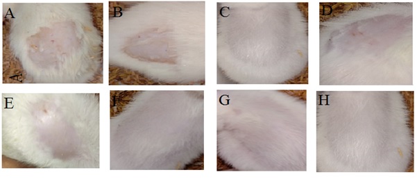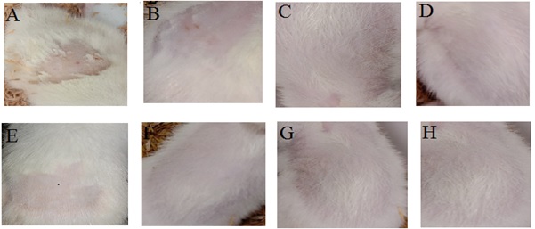 Fig. 3: Effects of topical formulation on hair density in albino rats. A-Normal control, B-Untreated, C-Standard (2 % w/v Minoxidil), D-Fenugreek seed extract solution, E-Fenugreek gel, F-FSE-SLN Gel, G-Marketed fenugreek hair oil (2.5% w/v) and H-Marketed fenugreek shampoo (2% w/v). Photographs were taken on 10th day after applying treatments on dorsal skin