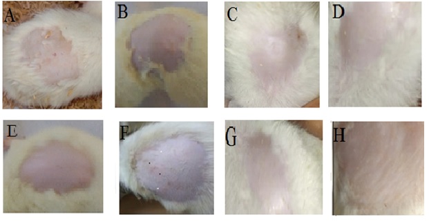 Fig. 4: Effects of topical formulation on hair density in albino rats. The back skin were topically applied with A-Normal control, B-Untreated, C-Standard (2 % w/v Minoxidil), D-Fenugreek seed extract solution, E-Fenugreek gel, F-FSE-SLN Gel, G-Marketed fenugreek hair oil (2.5% w/v) and H-Marketed fenugreek shampoo (2% w/v). Photographs were taken on 20th day after applying treatments on dorsal skin.