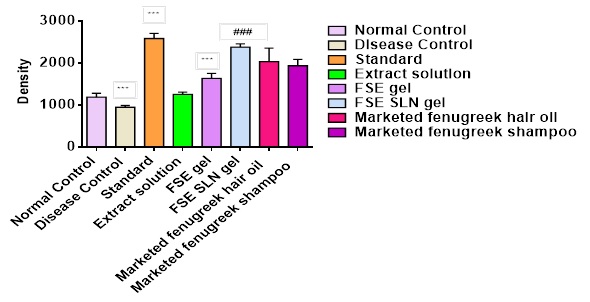 Fig. 6: Comparison of hair density of rats after beginning the treatment of standard, extract solution, FSE gel, FSE SLN gel, marketed fenugreek hair oil and marketed fenugreek shampoo. Results were shown as mean standard deviation (SD). (*** P<0.001, ### P<0.001), compared with normal control (n=6)