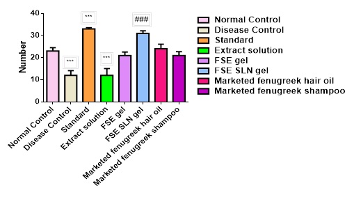 Fig. 7: Hair follicle count of rats after beginning the treatment of standard extract solution, FSE gel, FSE SLN gel, marketed fenugreek hair oil and marketed fenugreek shampoo. Results were showed as mean standard deviation (SD). (*** P<0.001, ### P<0.001), compared with normal control (n=6)