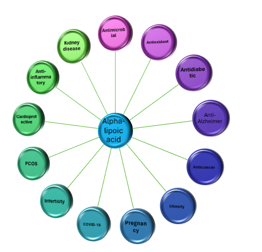 Alpha-lipoic acid (ALA, thioctic acid, 5-(1,2-dithiolan-3-yl) pentanoic acid) is an organosulfur compound produced by plants, humans, and animals. ALA plays a crucial role in mitochondrial bioenergetics reactions. It is a natural antioxidant and a dithiol compound. ALA is a coenzyme that plays a crucial role in the function of pyruvate and Alpha-ketoglutarate dehydrogenase complexes found in mitochondria. ALA has cytotoxic and antiproliferative effects on several cancers, including Polycystic Ovarian Syndrome (PCOS). Most of ALA's clinical applications come from its antioxidant properties, but it also shows potential in treating female and male infertility. Although ALA can potentially be a therapeutic agent, its pharmacokinetic profile limits its effectiveness. Research suggests that ALA has a short half-life and low bioavailability (around 30%) because it gets broken down in the liver, has reduced solubility, and is unstable in the stomach. Liquid formulations have higher bioavailability and plasma concentration than solid dose forms. This review covers the current clinical evidence on using ALA to prevent, manage, and cure numerous disorders, including diabetic neuropathy, obesity, central nervous system-related ailments, and pregnancy abnormalities.