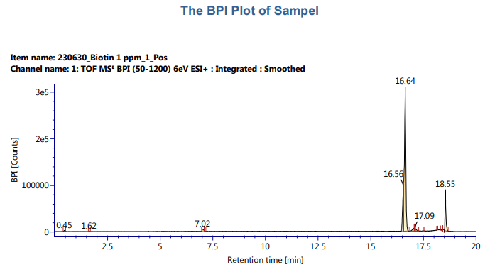 | Biotin | C10H16N2O3S | Identified | 7.03 | 0.2 | 12 | 0.86 | 2.75 | 18169 | +H |