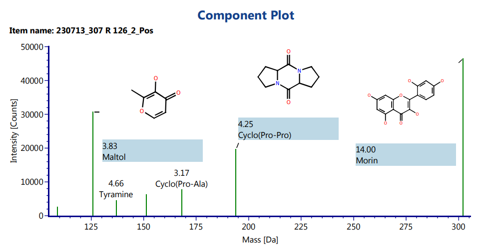 In fig. 2, the intensity of maltol is 3.83, cyclo (Pro-Pro) is 4.25 and morin is 14.00. These three main components have a high intensity of more than 20,000. This result is shown in table 2.