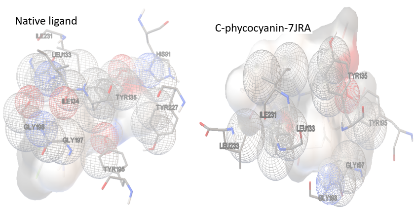 C-Phycocyanin has a binding affinity of-4.46 kcal/mol and an inhibition constant of 536.16 uM, with 1 atom in H-bond TYR195, compared to the native ligand, in fig. 4. The result of amino acid mapping in the c-phycocyanin complex areTyr195, Tyr227, Tyr135, Ile131, Leu133, Gly192, Ile134, Gly193, Leu133, and Leu233.