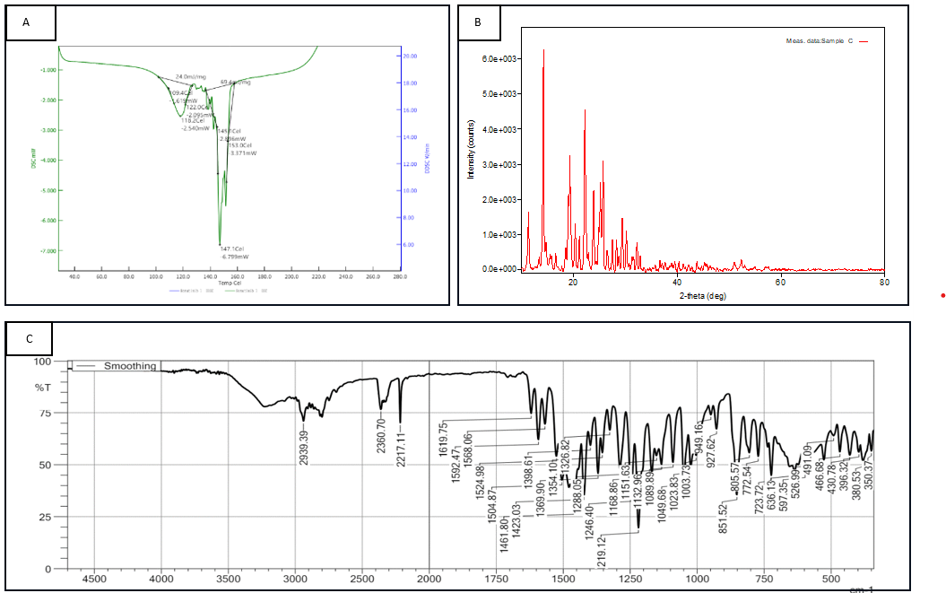 Fig. 2: Preformulation study of Bosutinib (A) DSC, (B) XRD, (C) FTIR