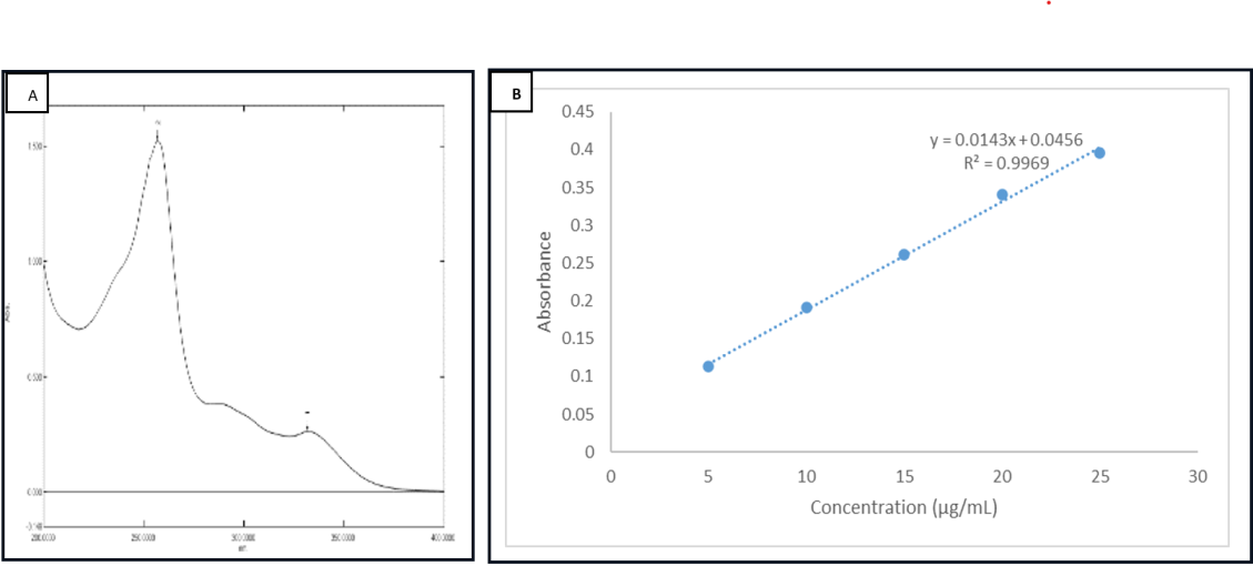 The resulting solution was scanned against methanol as a blank within the 200–400 nm wavelength range. The absorption curve displayed a distinctive absorption peak at 263 nm, and the UV-visible spectra were displayed in fig. 3 (A). Thus, (λmax) was chosen for bosutinib analysis. By further diluting the stock solution with methanol, a series of concentrations between 2 and 10 μg/ml were prepared and scanned at wavelength (263 nm) for the preparation of the calibration curve.