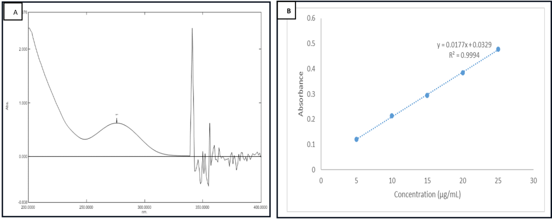 Fig. 4: (A) λmax of BNCs, (B) Calibration curve of BNCs at 277 nm