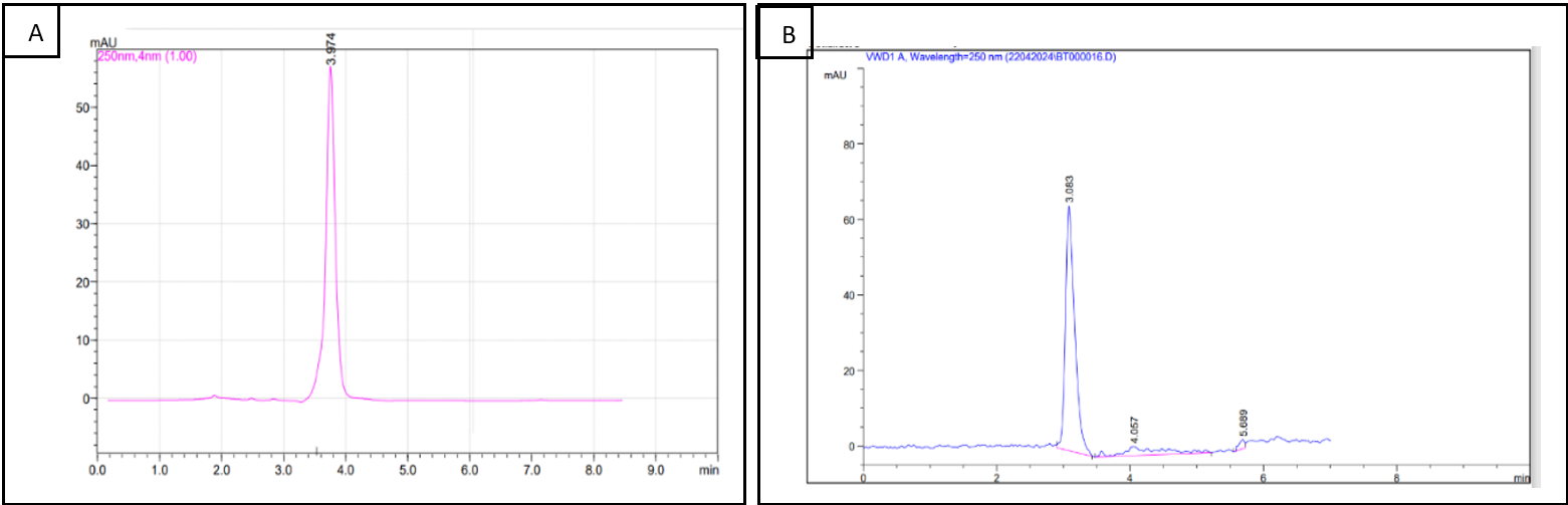 Fig. 5: HPLC chromatograms of (A) Bosutinib in mobile phase (B) BNCs Chromatographic conditions were injection volume 20 µl**; flow rate 0.7 ml/min; temperature 25 °C; run time 10 min; detection wavelength 250 nm