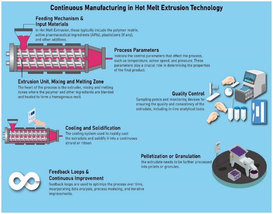 Amidst globalization, the pharmaceutical industry faces regulatory hurdles due to shortened patent lives and decreased drug profitability. This drives a transition towards CM processes, notably via HME, to expedite drug development. HME is a solvent-free and scalable green technology that provides efficient benefits. CM guarantees improved product quality, reduced labor costs, and faster development timelines than batch processes. This review delves into the evolving applications of CM and HME, addressing manufacturing challenges in the pharmaceutical sector.