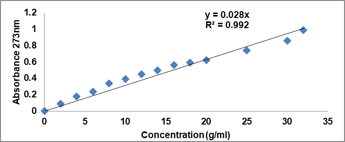 A stock solution 1 (1 mg/ml) of AF was prepared in pH 6.8 phosphate buffer. From the stock solution 1, a stock solution 2 (100µg/ml) was prepared. Solutions of different concentrations from 2 to 40 µg/ml were prepared from stock solution 2. Absorbance of the resulting solutions were measured by Ultra Violet, UV-visible spectrophotometer (UV-1900I SHIMADZU) at λmax 273 nm [12].