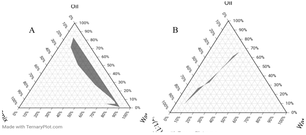 Fig. 2: Pseudo-ternary phase diagrams of aceclofenac in Smix1, and Smix2