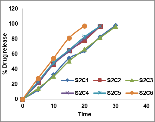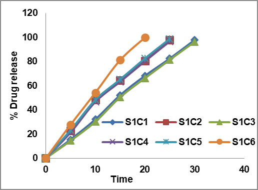 Fig. 4: In vitro drug release of formulations S1C1-S1C6 and S2C1 –S2C6