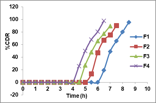 Lag time is the time at which the polymer coat ruptures and drug release starts. Dissolution of Aceclofenac tablets was performed in a United States of Pharmacopoeia (USP) dissolution tester, paddle method (Electrolab TDT-08L Plus, Dissolution tester USP Mumbai, India), under stirring at 100 rpm. The dissolution media consisted of 900 ml of phosphate buffer (pH 6.8) at 37 °C. Samples were withdrawn at regular time intervals, then filtered and analysed at 273 nm using a UV spectrophotometer. An equivalent volume of temperature-equilibrated fresh buffer was replaced following the removal of each sample. From these studies, both lagtime and % drug release were represented in fig. 5.