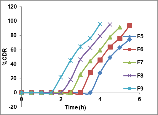 Bijapuri Srivastava et al. developed solid self-emulsified systems of AF with different combinations of oil, surfactant and co-surfactant mixtures. In the present study S1C1 to S1C6, and S2C1 TO S2C6 were formulated as solid SEDDS. [30] In vitro release profiles of prepared burst-release core tablets during 30 min studies were found to have very good drug release. In the formulated tablets, all the formulations show the drug release within 30 min. But in the formulation, S1C1 to S1C6 Containing Smix1 composition, and among them, S1C6 releases the maximum amount of drug, 98.88% in 20 min. Results of in vitro by study revealed that AF solubility was enhanced, and superdisintegrants SSG also help in drug release within 20 min. From S2C1 to S2C6, the formulation S2C6 containing Smix2 composition will release the maximum amount of drug, 96.45%, in 20 min. Both Smix1 and Smix2 were successful in developing the burst release core formulations of AF with the drug release within 20 min. by using the optimised S1C6 formulation as the core tablet, compression-coated formulations F1 to F9 were prepared. In the coat formulations both HPMCK100 and ethyl cellulose play an important role in the delay of drug release. Rashid R et al. were worked and succeeded in developing core and coat tablets with suitable lag time [31]. Matrix formed with the combination of these polymers helps to obtain suitable lag-time. These values can be represented in fig. 5. HPMCK100, with its swelling nature along with insoluble ethylcellulose will help in obtaining a suitable lag-time of 4 h. Among all the formulations, F4 shows maximum drug release of 97.23% at the end of 6th h.