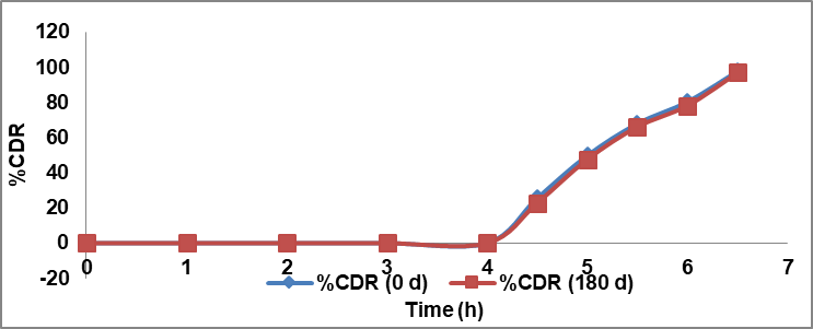 The formulated AFtablets were subjected to various kinetic studies like zero order (Cumulative percentage of drug released vs. time), first order (log cumulative percentage of drug unreleased vs. time), Higuchi equation (Cumulative percentage of drug unreleased vs. Square root of time), and Korsemeyer’s (log cumulative percentage released vs. log time). Accelerated stability study was carried out for optimised batch (F4) at 40±2 °C/75±5% RH over a 3-month period according to International Conference of Hormonisation (ICH) guidelines in the stability chamber (Thermolab India). At the end of the 3 mo, the tablets were examined for physical characteristics and drug content. In the fig. 6, stability studies data of in vitro drug release and lag time at the end of 3 mo (180 d) were represented [25, 26].