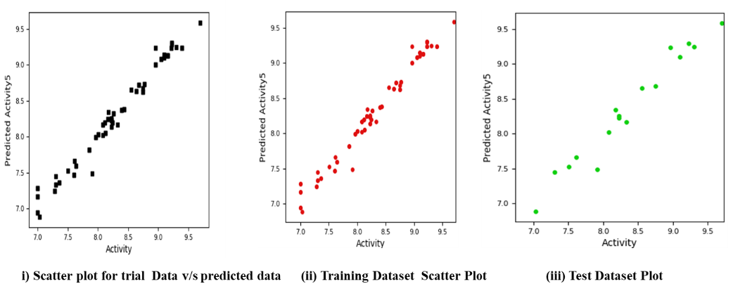 An ideal data set for building suitable QSAR models to forecast activity was offered by the structural variability and its association with a wide range of biological activities. A dataset of 50 molecules was used to create this model. The training set's 83% split was then maintained with PLS factor set to five. The scattered plot’s best-fit line was obtained. A better model with highest activity was selected out of 5 different molecules. The selected model had R2 of (0.979) and Q2 of (0.9558). Table 2 displays the atom-based QSAR data for the chosen model with five PLS factors.