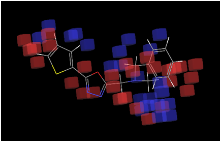 Table 3 illustrates the 3D QSAR analysis across electron-withdrawing, negative, and positive ionic interactions in addition to hydrophobic interactions. According to established activity criteria, dark blue areas indicate positive activity while red portions indicate negative activity. The QSAR model's visual aids facilitate comprehension of the correlation between the biological efficacy and structural features of the ligand molecule as well as the effects of functional group substitution on activity [25, 26].